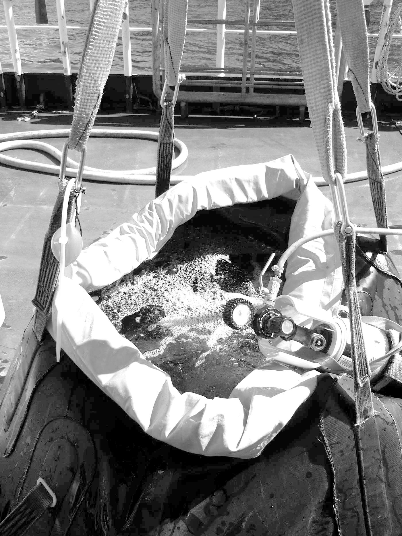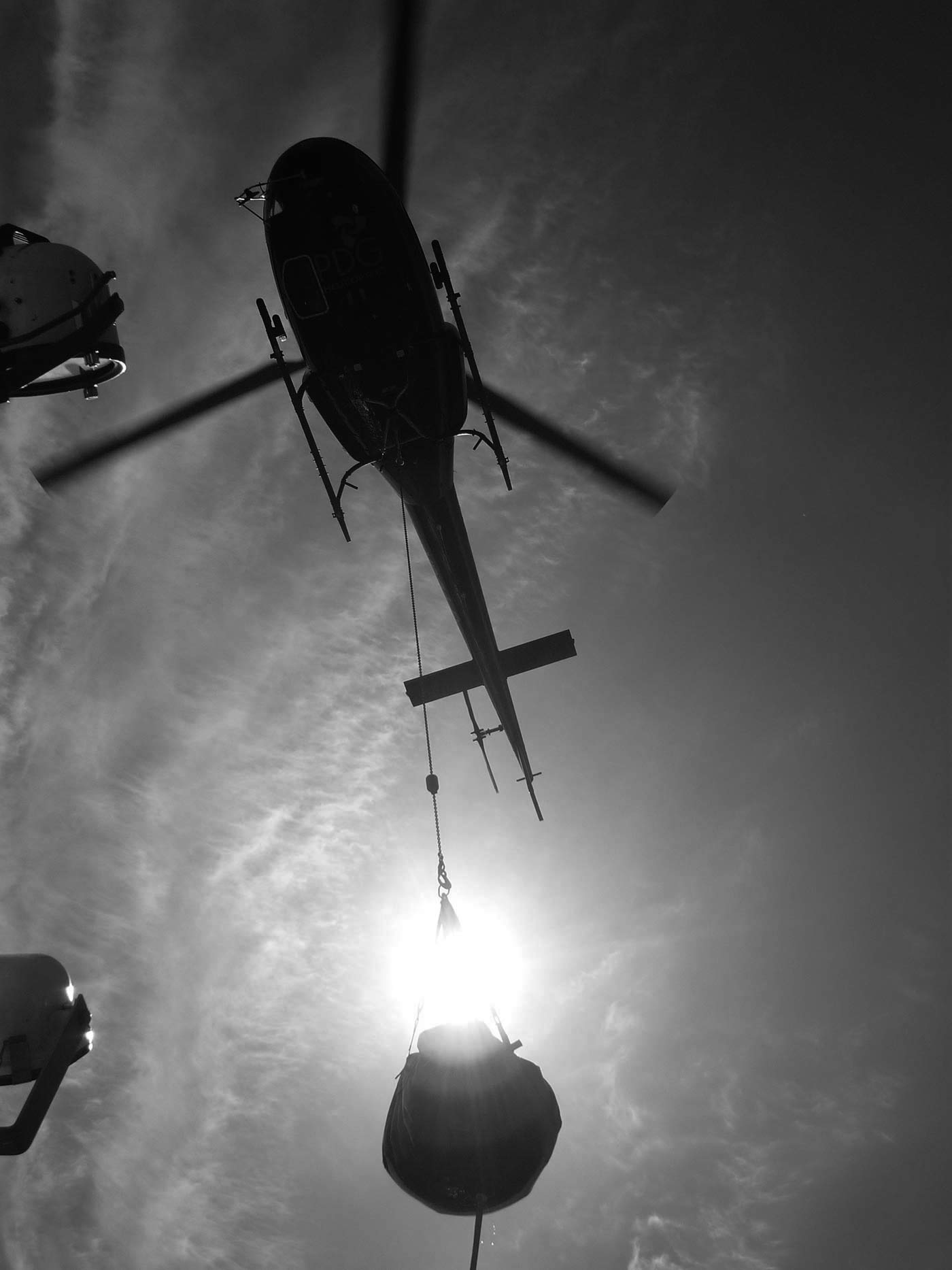 Dann setzt das tiefe, vibrierende Schlagen eines Helikopters ein. Kein dramatischer Auftritt, kein Showeffekt, sondern ein Arbeitsprozess. Die Maschine bleibt nicht etwa stehen oder landet, sondern verharrt schwebend nur wenige Meter über dem Wasser – ein technisch präziser Eingriff in die Landschaft, hörbar im Brustkorb, aber klar im Zweck. Unter ihr hängt ein ovaler Wasserbehälter, gefüllt mit frischem Meerwasser; an seinen Seiten befestigt Sauerstoffflaschen, die die Versorgung während des Transports sicherstellen. Es ist kein Container – es ist ein beweglicher Teil des Meeres.