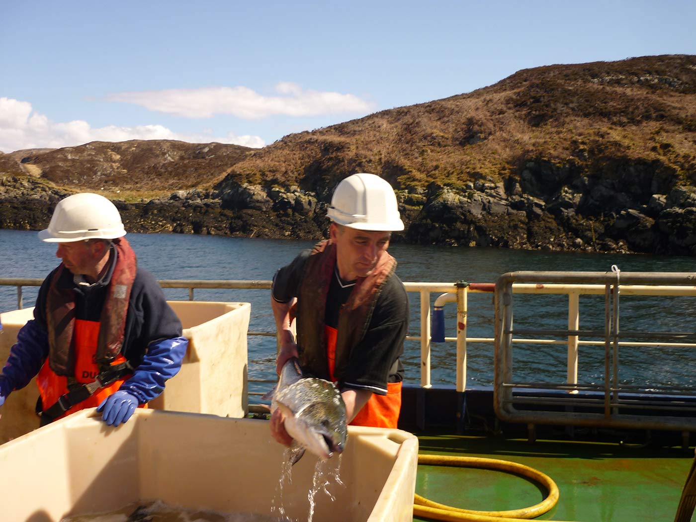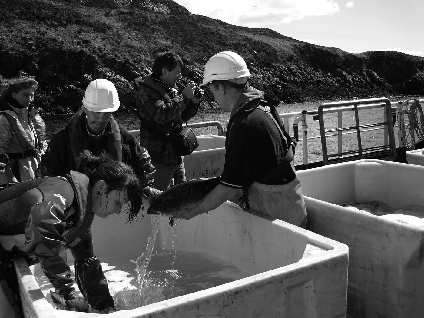 Einer nach dem anderen werden die Lachse aus den Händen der Mitarbeiter direkt in diesen flüssigen Zwischenraum übergeben. Das Wasser spritzt, die Kleidung wird nass, die Luft ist erfüllt von Winddruck, Rotorenwirbeln und der konzentrierten Anspannung der Menschen, die Seite an Seite arbeiten.